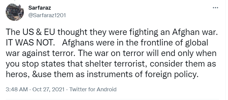 The Afghan commando in his tweets said that the American and European Union (EU) forces were wrong in thinking that they were fighting an 'Afghan war' as Afghans were in the frontline of the global war against terrorism. "The war on terror will end only when you stop states that shelter terrorists," he said.