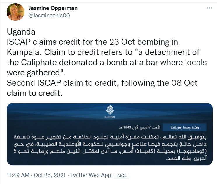 It was reported on October 8 that ISIS had claimed first attack ever in Uganda, taking credit for IED blast on police in Kampala.