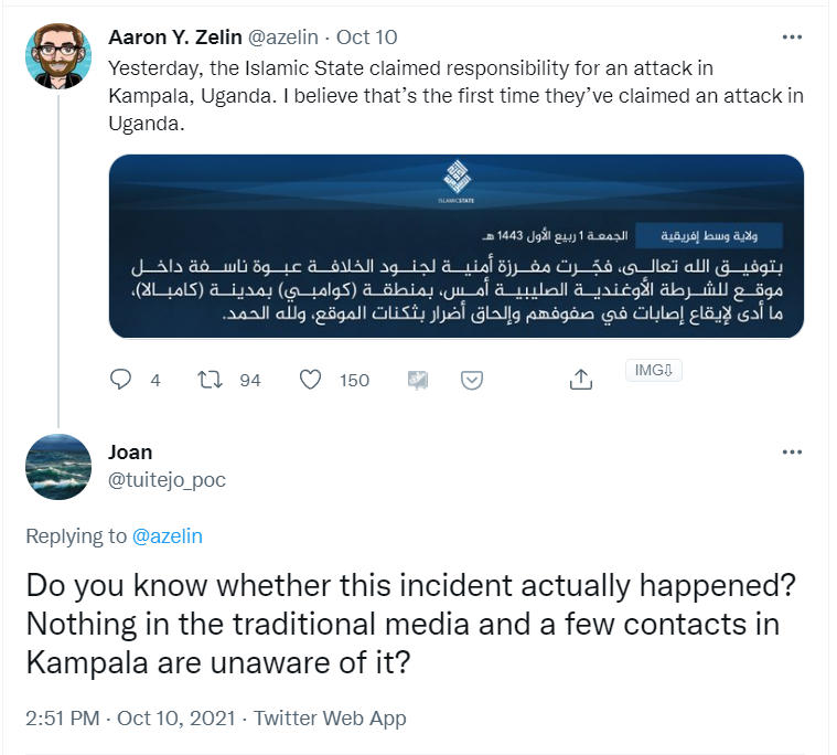 While the Ugandan government neither confirmed nor denied, there were some hostilities towards some foreign entities, such as the UK-based African Centre for Intelligence and Security (@AFRICISOrg), that among those who reported about the attack