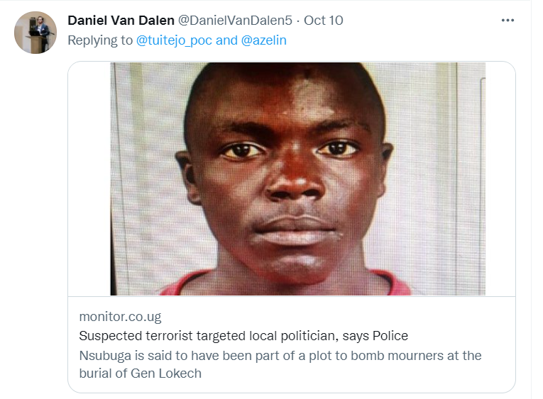 Another incident occurred on October 4 this year, when Ugandan security operatives shot dead a suspected terrorist Hamid Nsubunga, is said to be the second suspect who attempted to set off a bomb at the burial of the Deputy Inspector General of Police, Lt Gen Paul Lokech, in Pader District in August.