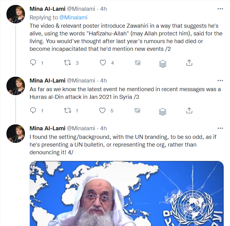 As-Sahab has released a video of Dr. Ayman al Zawahiri. The video is entirely focused on the role of United Nations and how it poses a “threat” to the Muslims Ummah. I have not noticed any mentioning of recent events in the entire 39 minutes long video. https://t.co/UqPqsEX0At pic.twitter.com/IPTdOW4dty