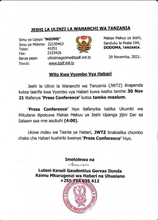 In Unusual Move, Tanzania Military Announces They Will Hold Presser Today to Make "Special Declaration."