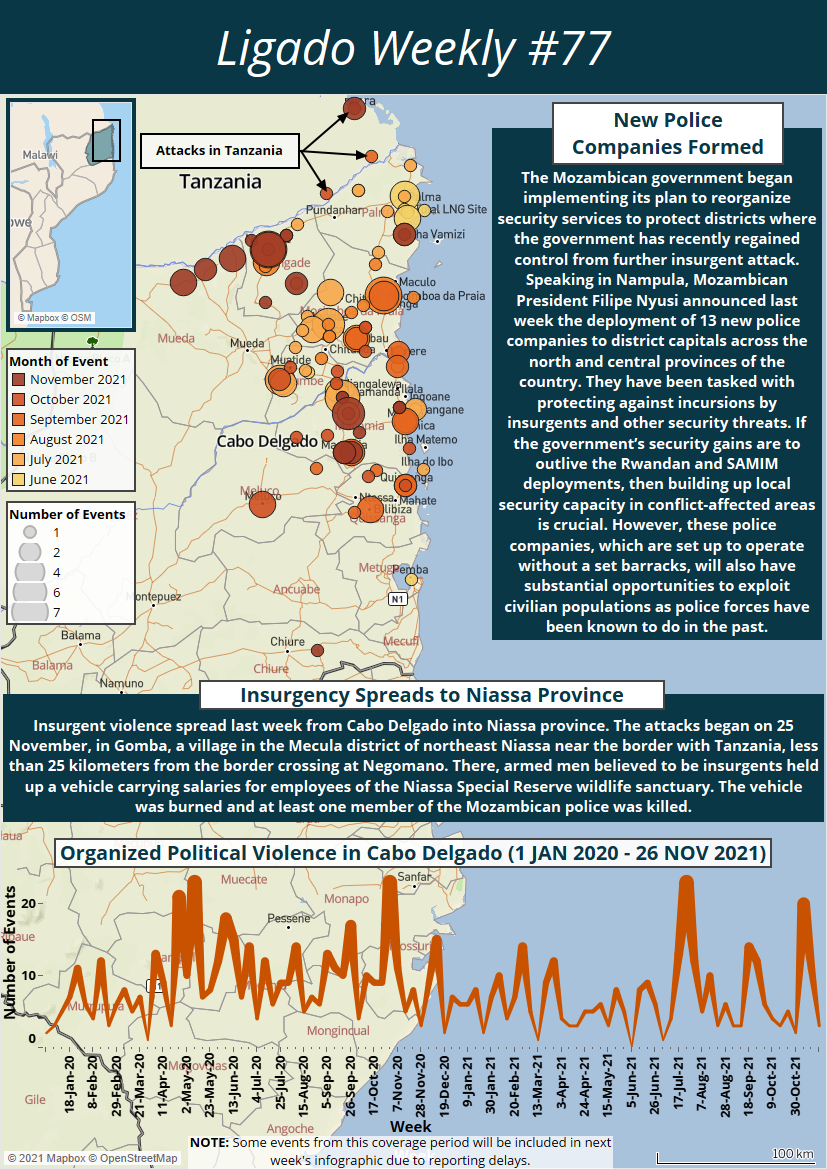 The Cabo Delgado conflict is now more accurately referred to as “the Cabo Delgado and Niassa conflict,” as insurgent violence spread last week into Niassa province. The attacks, which will be covered in depth in this week’s Incident Focus section, began on 25 November in Gomba, a village in the Mecula district of northeast Niassa near the border with Tanzania, less than 25 kilometers from the border crossing at Negomano. There, armed men believed to be insurgents held up a vehicle carrying salaries for employees of the Niassa Special Reserve wildlife sanctuary. The vehicle was burned and at least one member of the Mozambican police was killed (one report says that four police officers were killed).